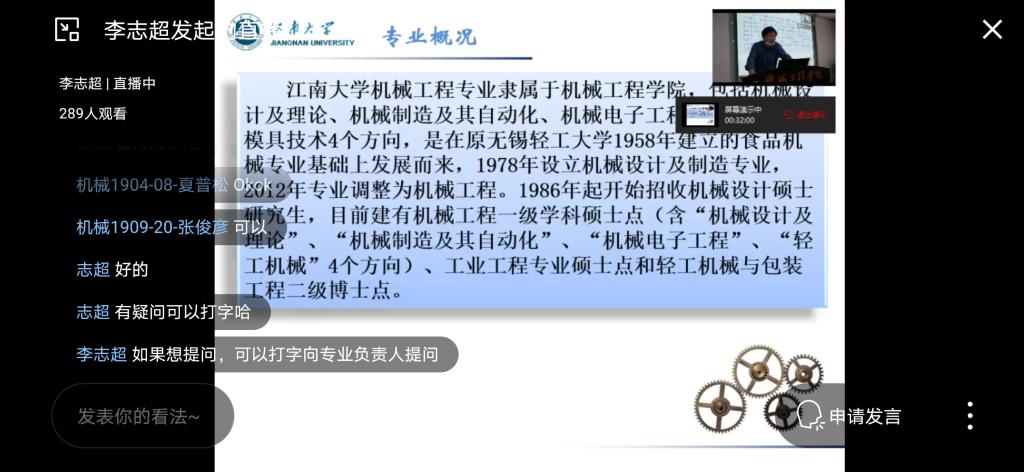 为了使学生能根据自身特长和意愿,结合当前学业成绩选择专业。机械电子工程、机械工程、过程装备与控制三个专业的教师分别从师资力量、培养方案、学术研究、就业情况、未来发展方向及本专业优秀校友介绍等方面做了全面详尽的介绍,帮助学生全面了解专业情况。学生在线提问不断,各专业教师和学院相关管理人员全程在线与学生保持互动交流,帮助学生深入了解各专业,并做出适合的选择。