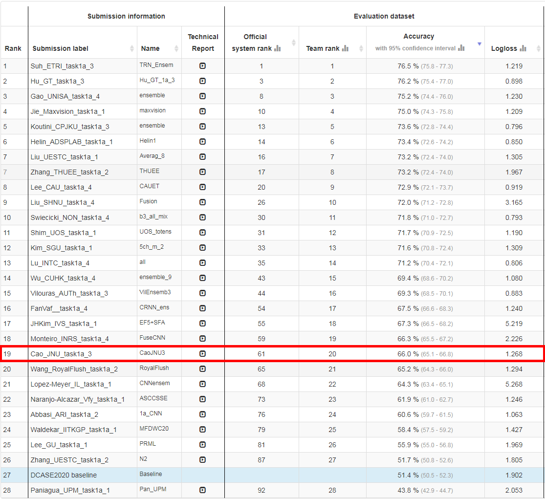 2020全球声学场景和事件的检测和分类竞赛(DCASE2020 Challenge, IEEE AASP Challenge on Detection and Classification of Acoustic Scenes and Event)于7月1日圆满落下了帷幕,在全体师生的共同努力下,由必赢官网437437必赢国际网址曹毅教授指导的声学场景分类团队Cao_JNU(团队成员:硕士研究生费鸿博、黄子龙、刘晨,指导教师:曹毅)首次参加该项比赛便取得了优异的成绩。