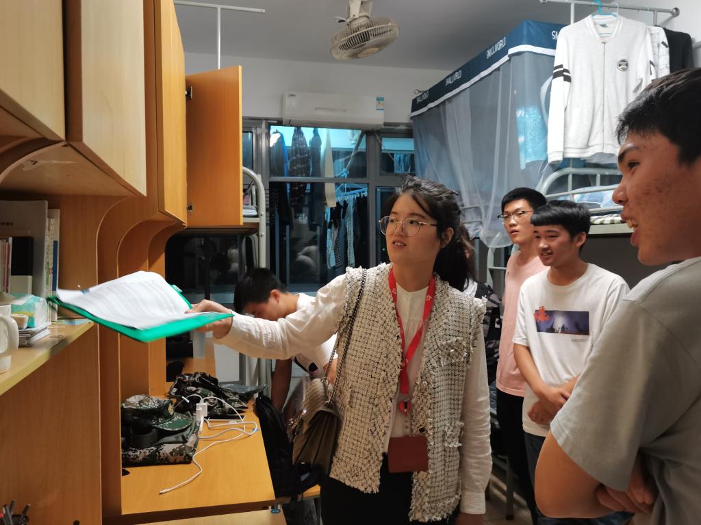 大学生军事训练是国防教育的重要组成部分,为给新生提前树立内务整洁意识,10月11日晚,437437必赢国际网址组织了一次内务检查与指导活动,2020级辅导员潘智琦、退伍老兵杨飞龙、部分班主任在各副班的陪同下深入新生宿舍。