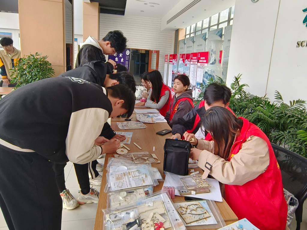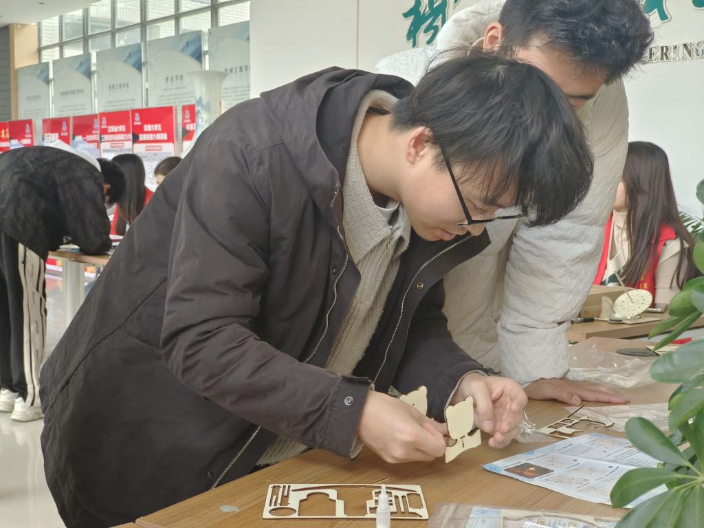 活动分为两个主要赛道:“创想机械”和“盒出心裁”。前者要求参与者利用已有材料和图纸制作简单机械作品,而后者则要求根据给定的图纸对纸张进行裁剪和折叠,最终完成各种盒子的制作。同学们自主选择参与的赛道,现场工作人员对选手进行作品制作的指导。同学们在参与活动时表现出高度的专注度,许多选手在完成作品后激动地相互展示,工作人员则帮助选手与其完成的作品合影留念,现场氛围非常愉悦。最终选手将完成的作品提交评判席进行评审,评委根据作品的完成度赠予选手礼品。