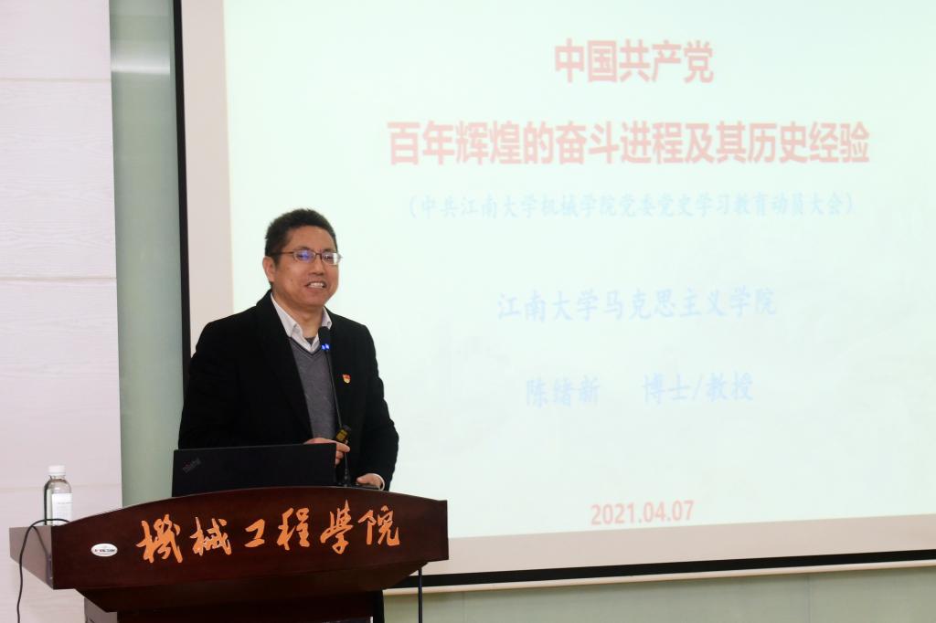 校党委讲师团成员、马克思主义学院陈绪新教授以“中国共产党百年辉煌的奋斗进程及其历史经验”为题,作了特邀专家辅导报告。报告分“开天辟地:中国共产党在新民主主义革命时期完成救国大业;改天换地:中国共产党在社会主义革命和建设时期完成兴国大业;翻天覆地:中国共产党在改革开放和社会主义现代化建设新时期推进富国大业;惊天动地:中国共产党在中国特色社会主义新时代推进并将在本世纪中叶实现强国大业”四个部分,史料详实、深入浅出,讲座充满激情与互动,与会师生党员深受教育,取得了较好的效果。