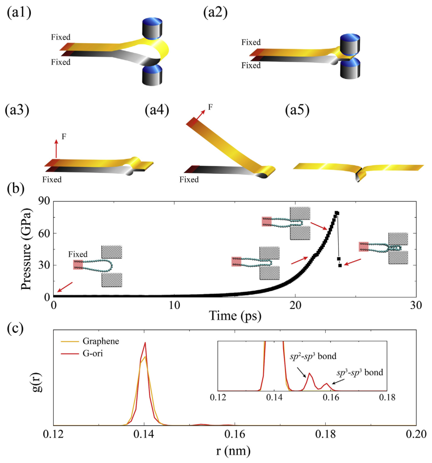 图1. 仿照纸张折叠的过程,石墨烯带在挤压下形成折痕。Carbon((2020) 165, 259-266)