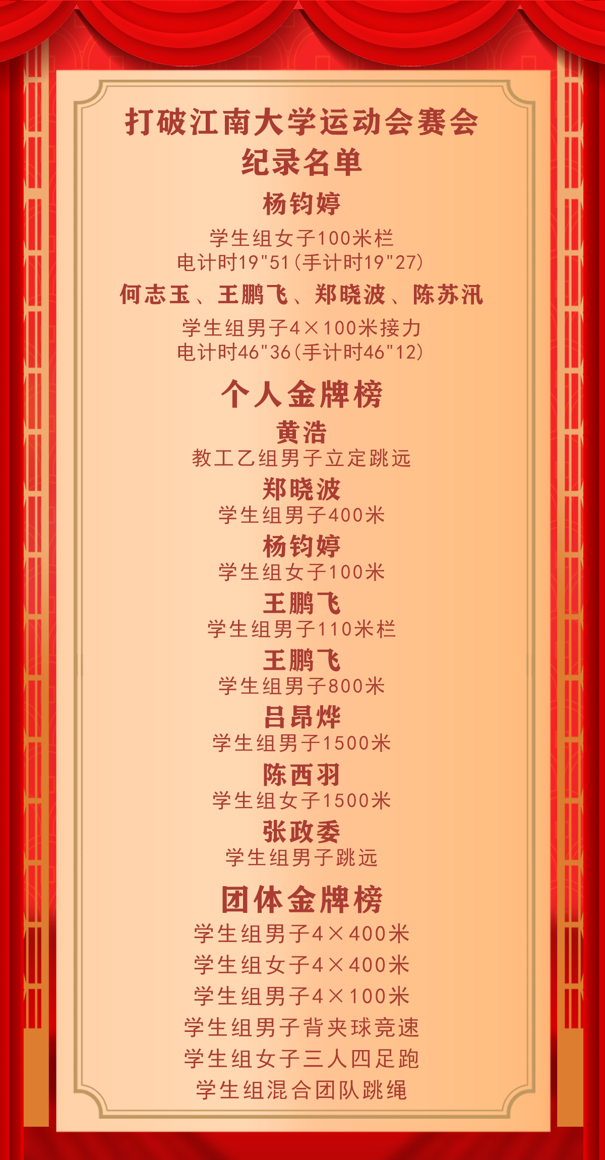 体育强则中国强,国运兴则体育兴。机械师生在本届运动会上团结协作、奋勇争先,用强健体魄和奋发有为的精神品质弘扬中华体育精神,充分展现了新时代青年人蓬勃,积极向上,团结奋斗的精神风貌。希望同学们在今后的生活中培养运动习惯,增强身体素质,发扬体育精神,成为全面发展的江南人。