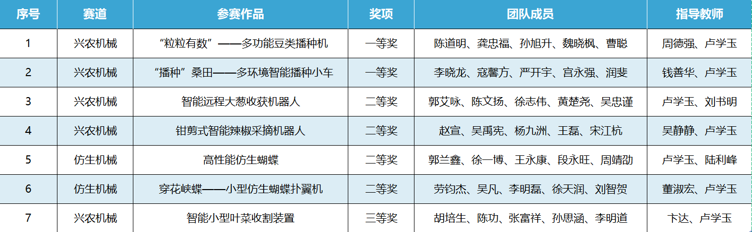 本届赛事以“机械创新推进农业现代化、自然和谐迈向仿生新高度”为主题,以兴农机械、仿生机械为设计方向,经过设计资料审阅、现场答辩和实物演示等多环节紧张激烈的角逐,《“粒粒有数”——多功能豆类播种机》《“播种”桑田——多环境智能播种小车》获一等奖,《智能远程大葱收获机器人》《钳剪式智能辣椒采摘机器人》《高性能仿生蝴蝶》《花峡蝶——小型仿生蝴蝶扑翼机》获二等奖,《智能小型叶菜收割装置》获三等奖。