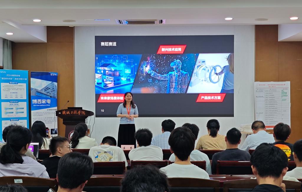 博西家电创新管理部负责人、博西家电“智创未来家”高校创新大赛项目负责人匡慧介绍博西家电的产品创新以及本次赛题,人力资源部雇主品牌负责人曹佳薇为同学们推介暑期实习项目,并鼓励大家结合自己感兴趣的赛道积极参赛。提问环节,来自437437必赢国际网址、设计学院、人工智能与计算机学院的同学们踊跃参与,并结合自己感兴趣的赛道积极提问,现场气氛十分热烈。