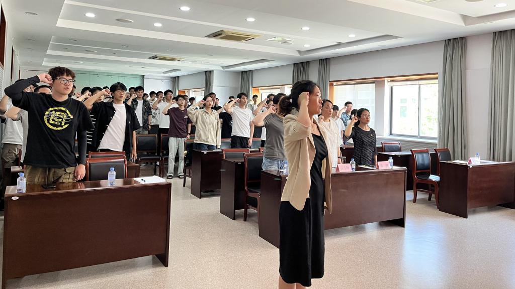 党课结束后,孟召双带领全体毕业生党员重温入党誓词,党员们面向党旗庄严宣誓,在铮铮誓言中重温入党初心,坚定理想信念,牢记初心使命。梁楠还就毕业生党员相关的预备党员转正程序、党组织关系转接手续等作专题培训,并结合相关案例对同学们进行了工作提醒。