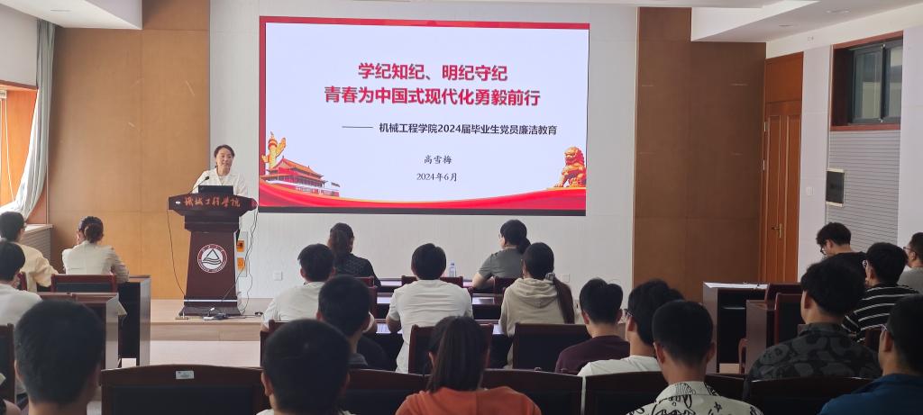 高雪梅以《学纪知纪、明纪守纪,青春为中国式现代化勇毅前行》为题为毕业生党员带来党纪学习教育主题党课,系统解读了《中国共产党纪律处分条例》修订的背景和主要内容,并就《中国共产党章程》《关于新形势下党内政治生活的若干准则》等党内纪律规定中与学生党员密切相关的内容作重点讲解,以鲜活案例生动讲述了我们党推进全面从严治党的重要意义和现实举措,引导毕业生党员“知敬畏、存戒惧、守底线”。她寄语毕业生党员坚定理想信念、锤炼优良作风、增强能力本领、秉持敬畏之心,争做有理想、有信念、肯吃苦、能担当的新时代青年。