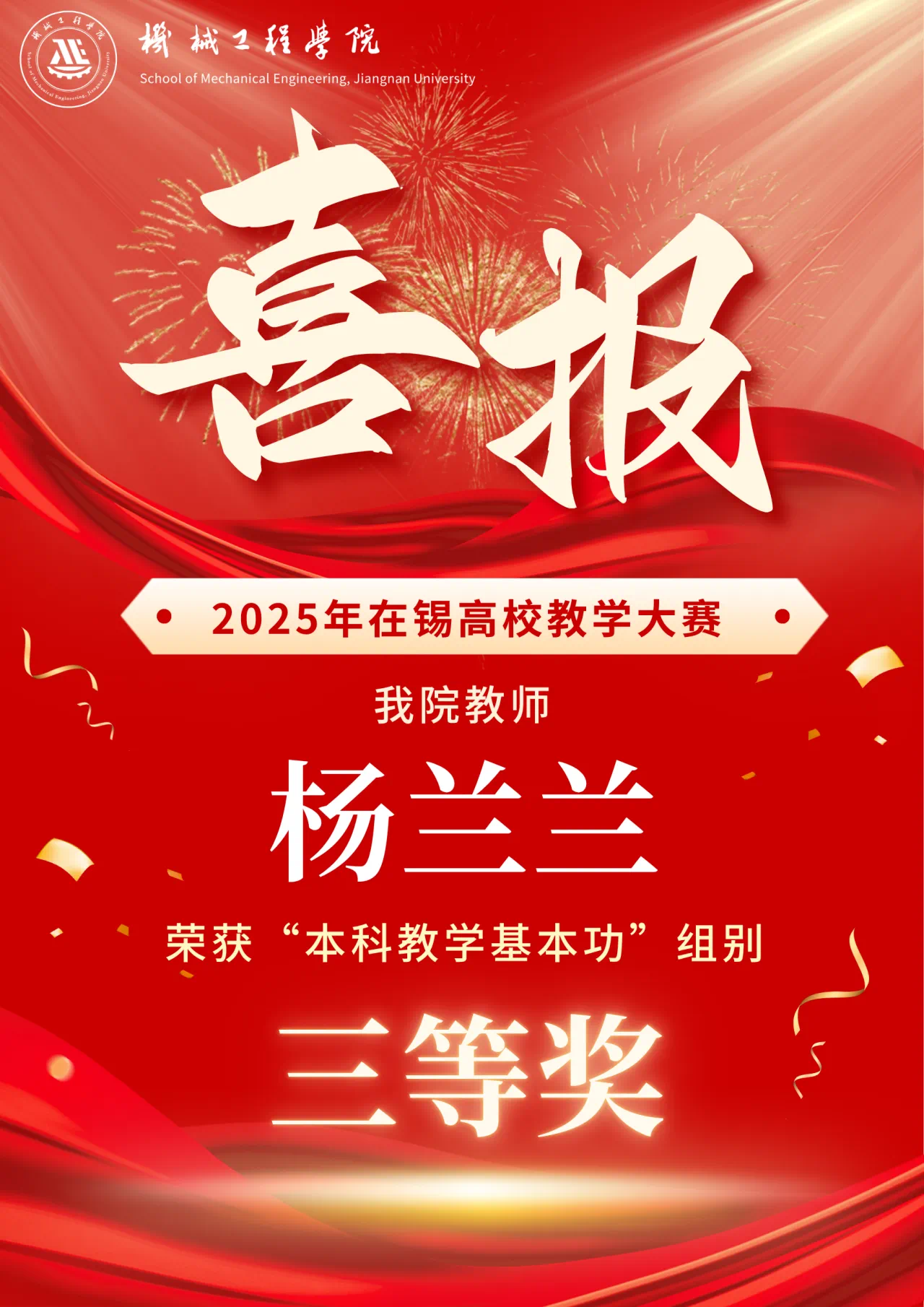 近日,由无锡市教育局高等教育处主办的“2025年在锡高校教学大赛”评选结果揭晓。经过激烈角逐,我院教师黄舒婷在“新教师说课展示”组别荣获一等奖,杨兰兰在“本科教学基本功”组别荣获三等奖,董淑宏在“教学创新”组别荣获三等奖。